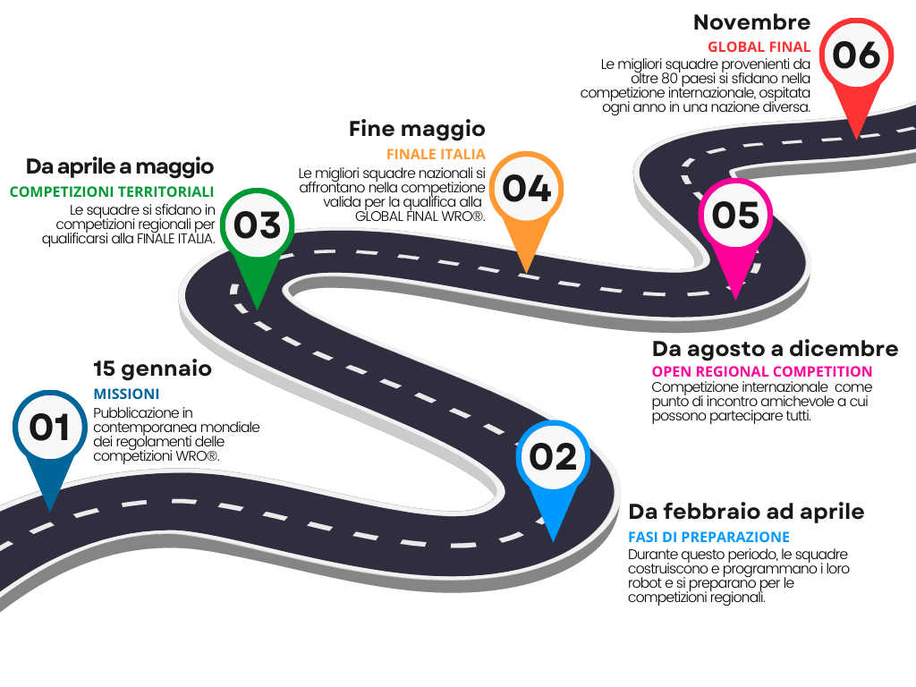 La stagione in WRO® è scandita da diverse tappe, per non tutte le squadre devono prepararsi per arrivare subito alla finale mondiale. C’è chi inizia con piccole gare interne alla scuola, chi si ferma alle territoriali, chi punta alla Finale Italia e chi sogna di raggiungere la Finale Mondiale.
